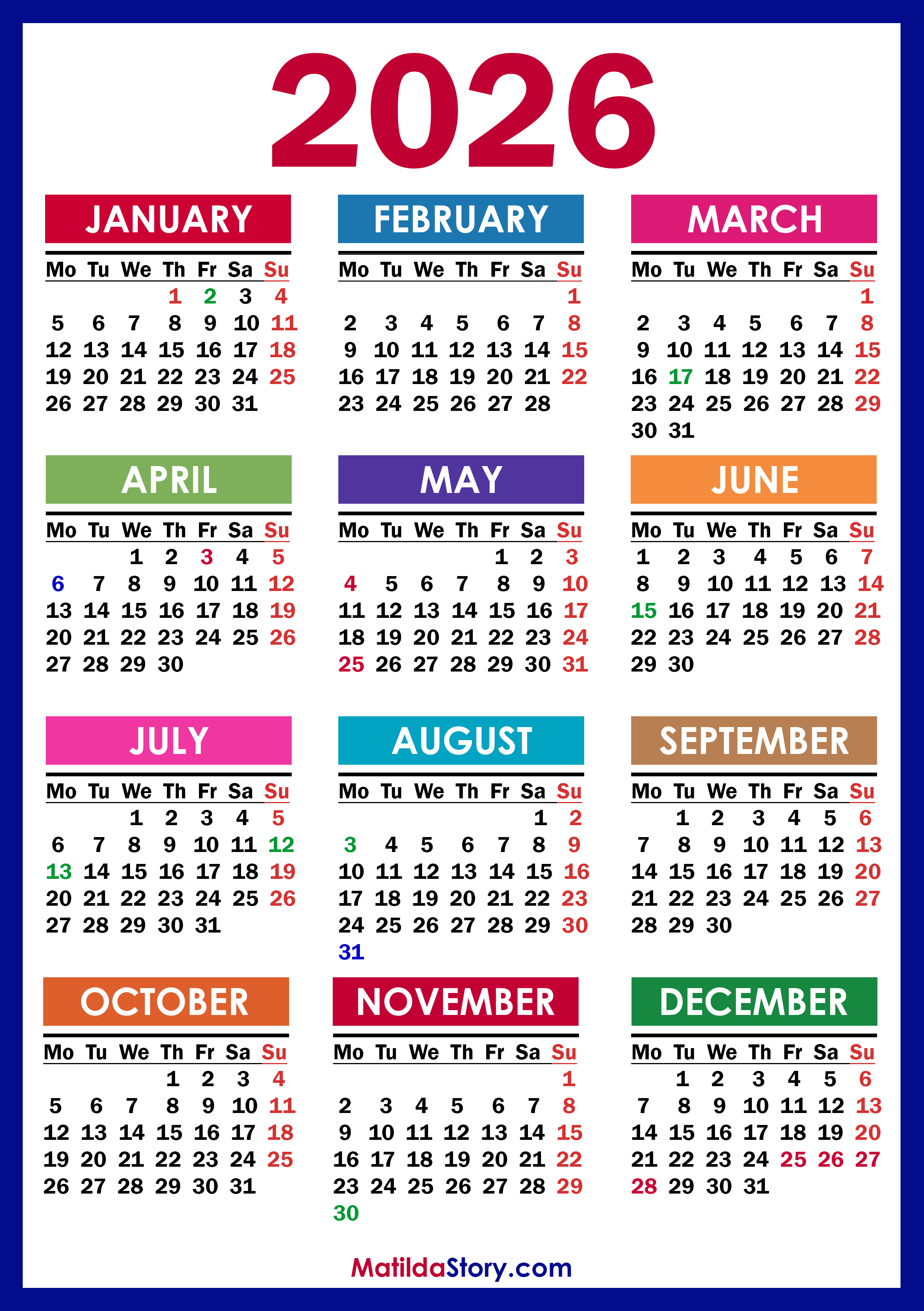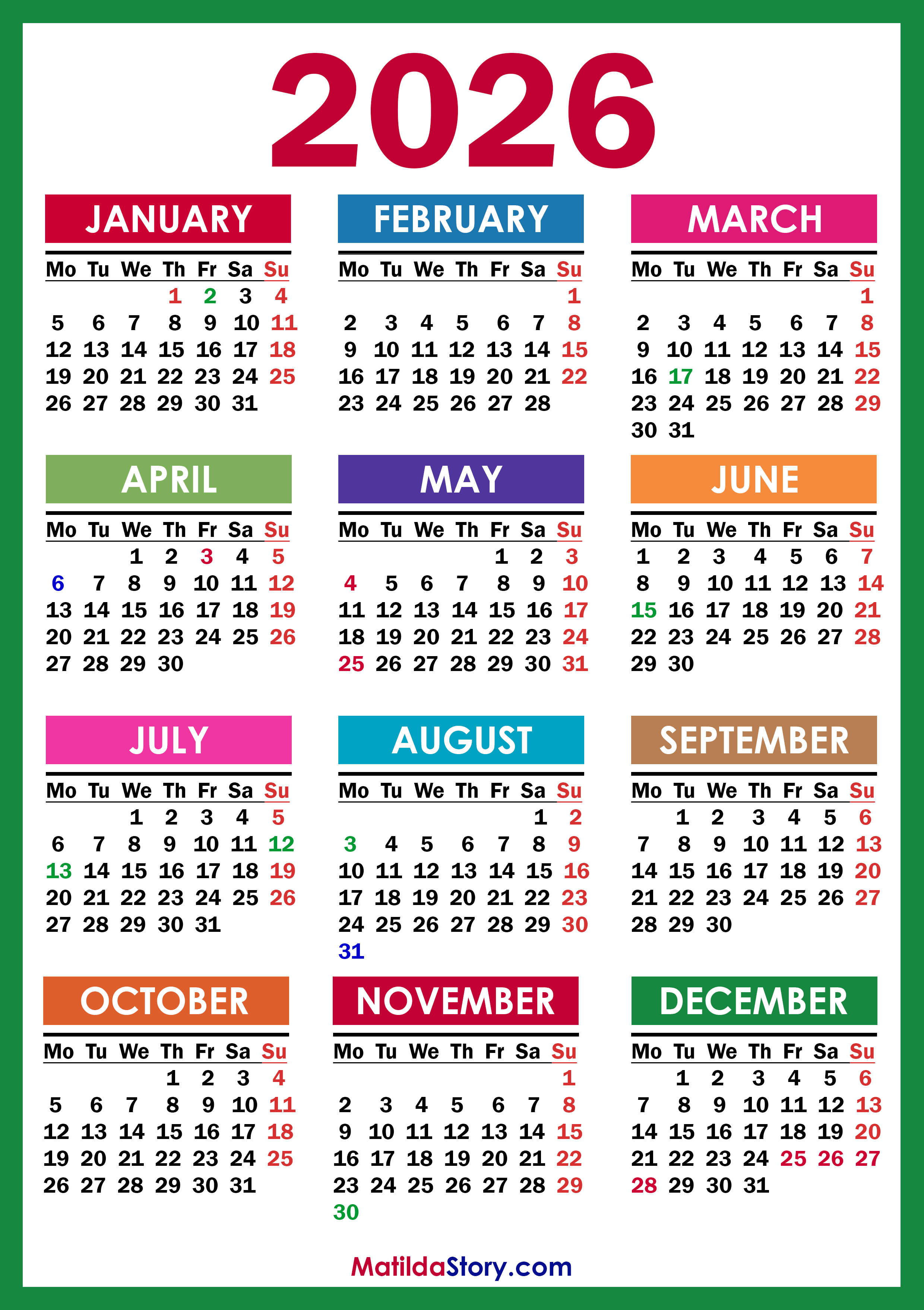 Free Printable 2026 Calendar with UK Holidays – Colorful (Green Frame)
