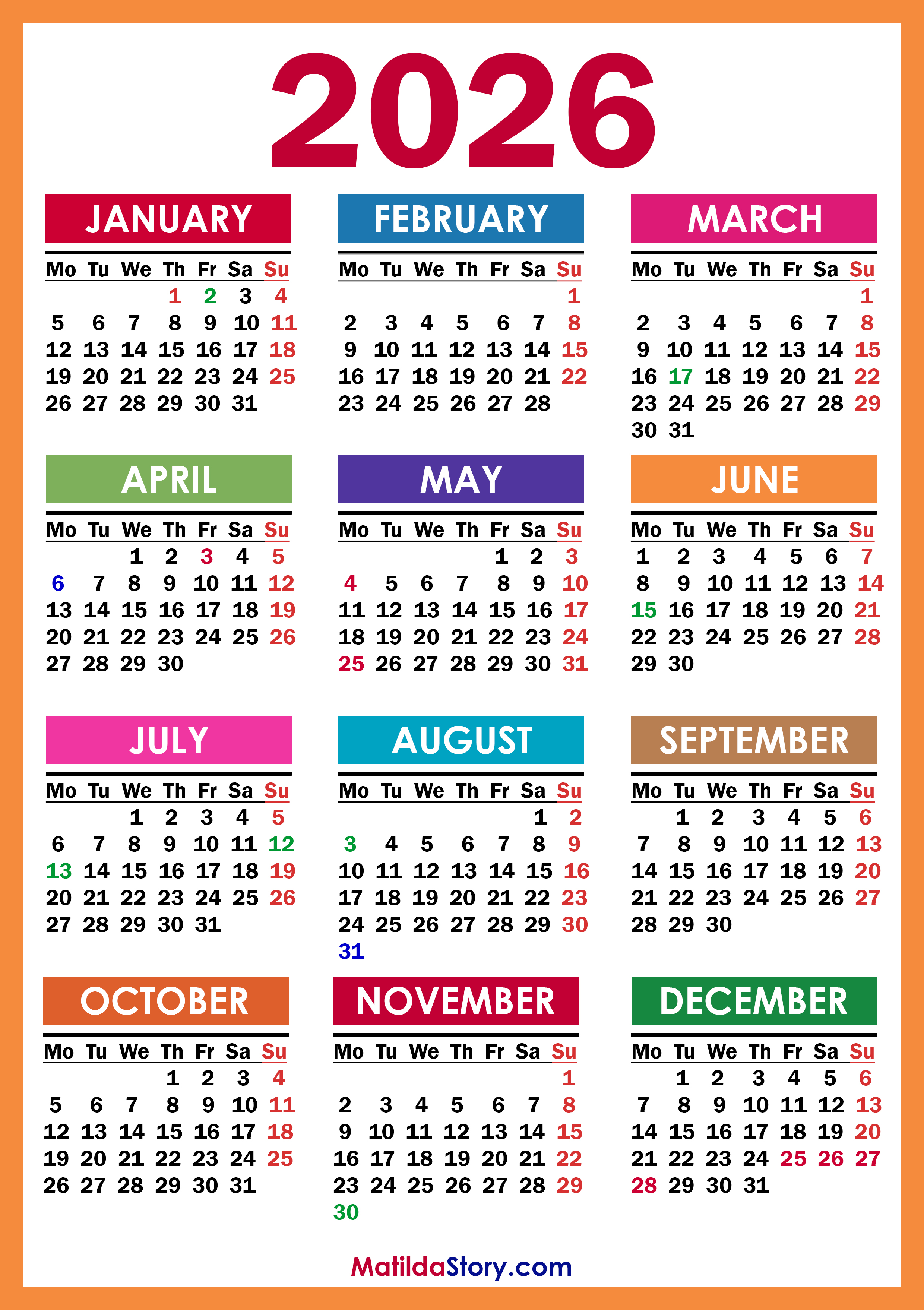 Free Printable 2026 Calendar with UK Holidays – Colorful (Orange Frame)
