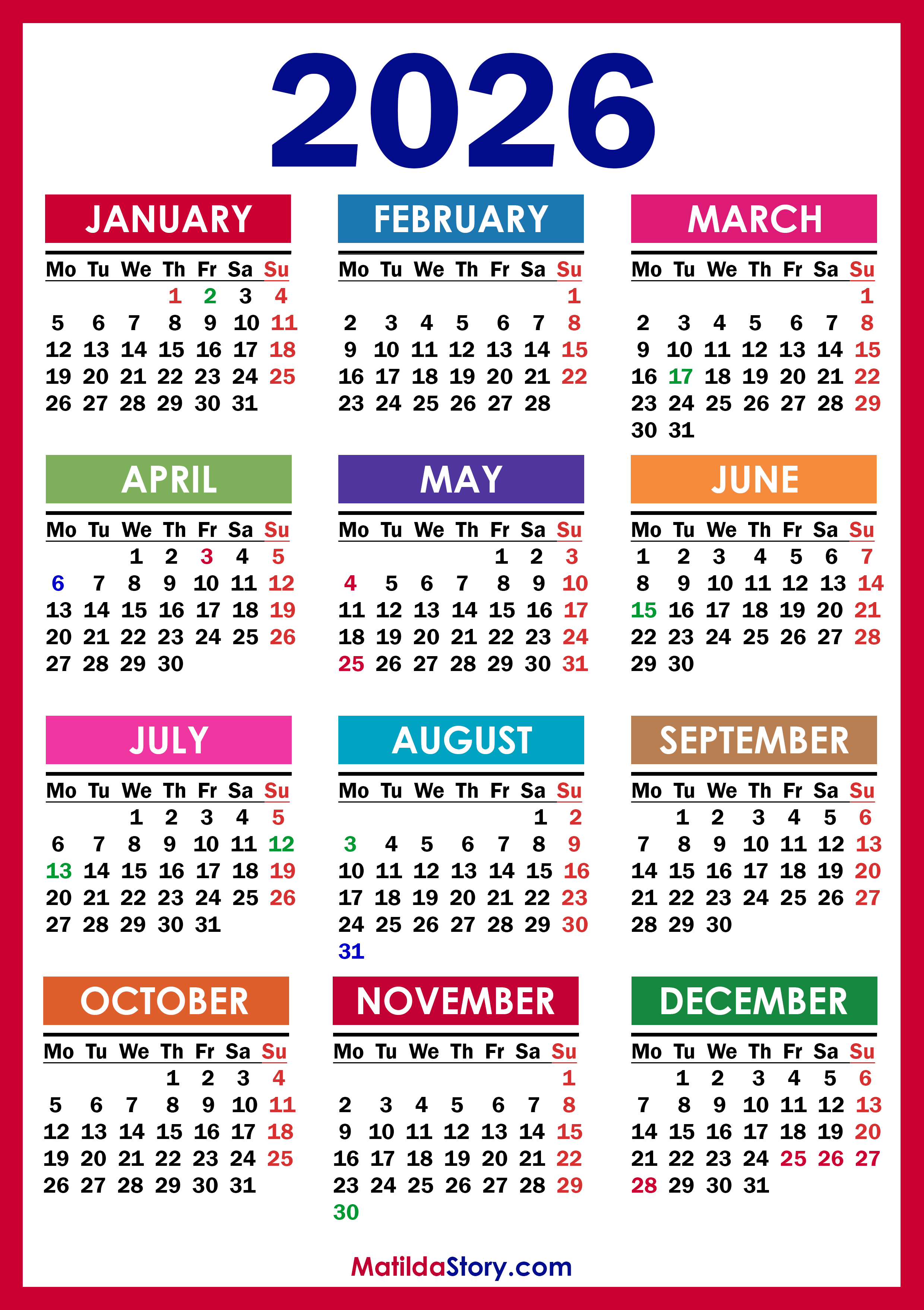 Free Printable 2026 Calendar with UK Holidays – Colorful (Red Frame)