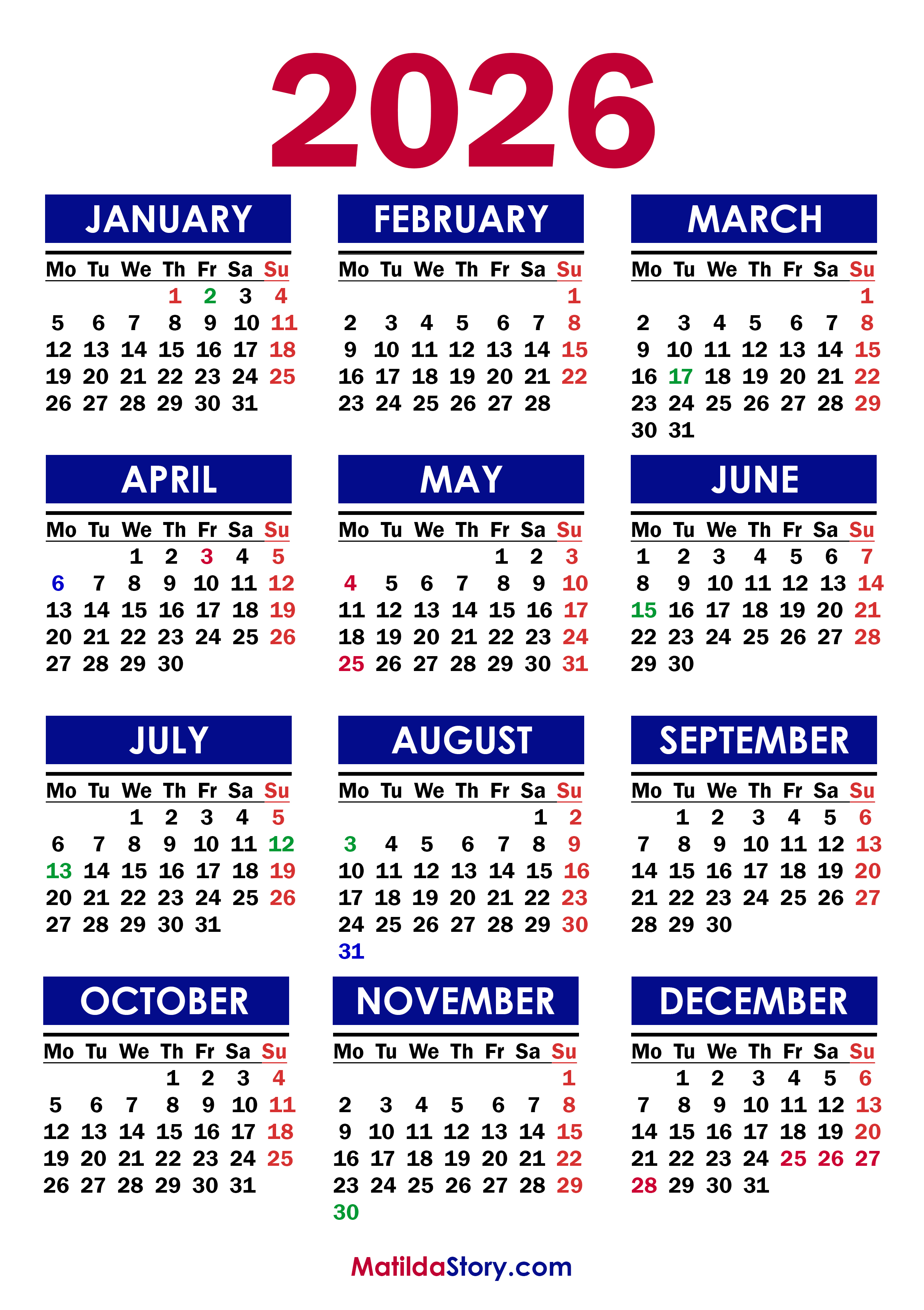 One Page 2026 Yearly Calendar