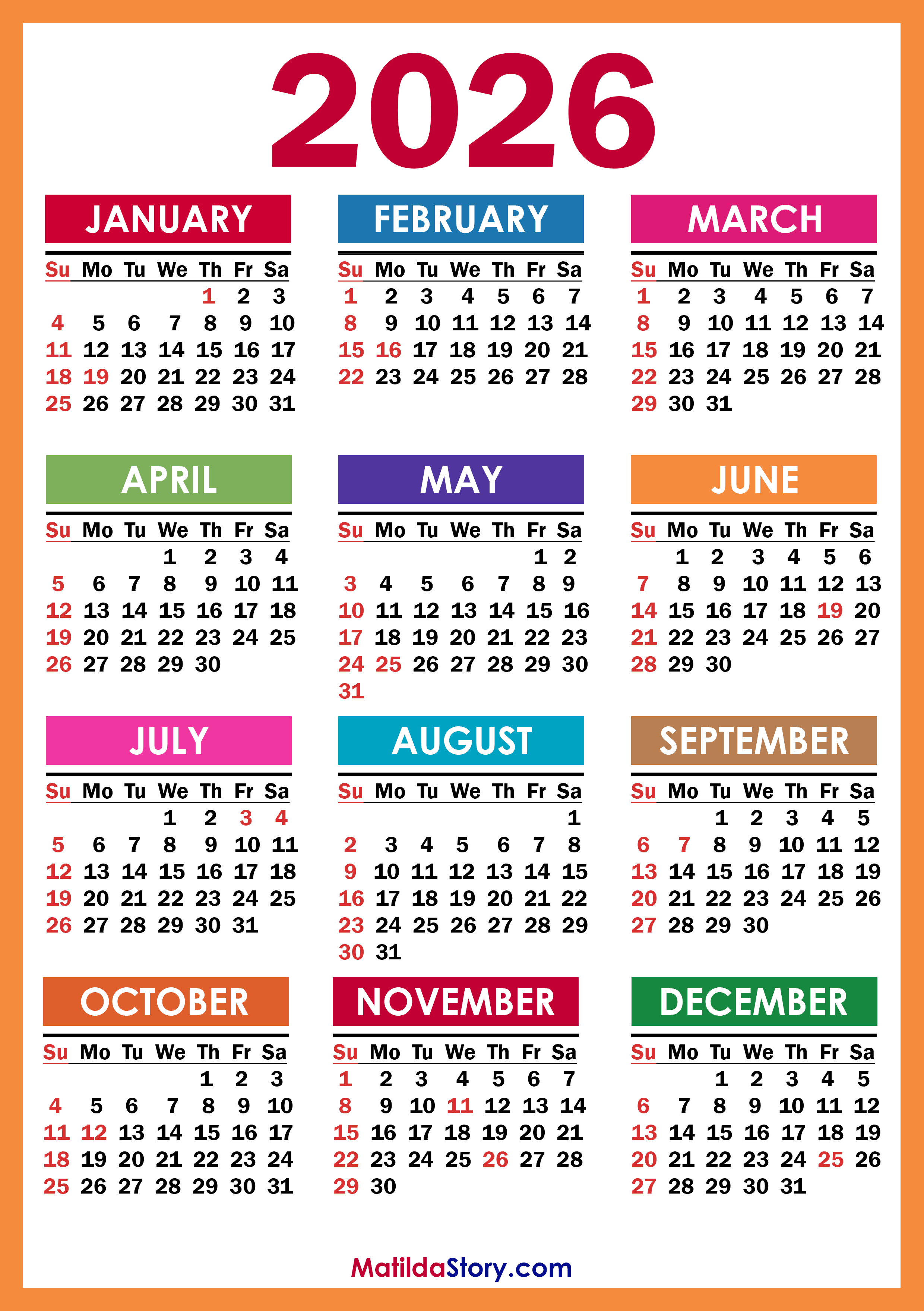 Free Printable 2026 Calendar with US Holidays – Colorful (Orange Frame)