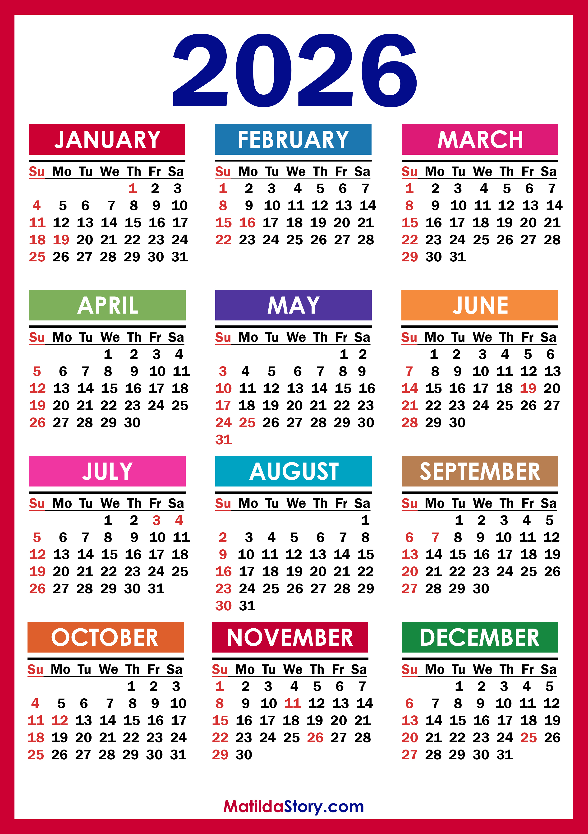 Free Printable 2026 Calendar with US Holidays – Colorful (Red Frame)