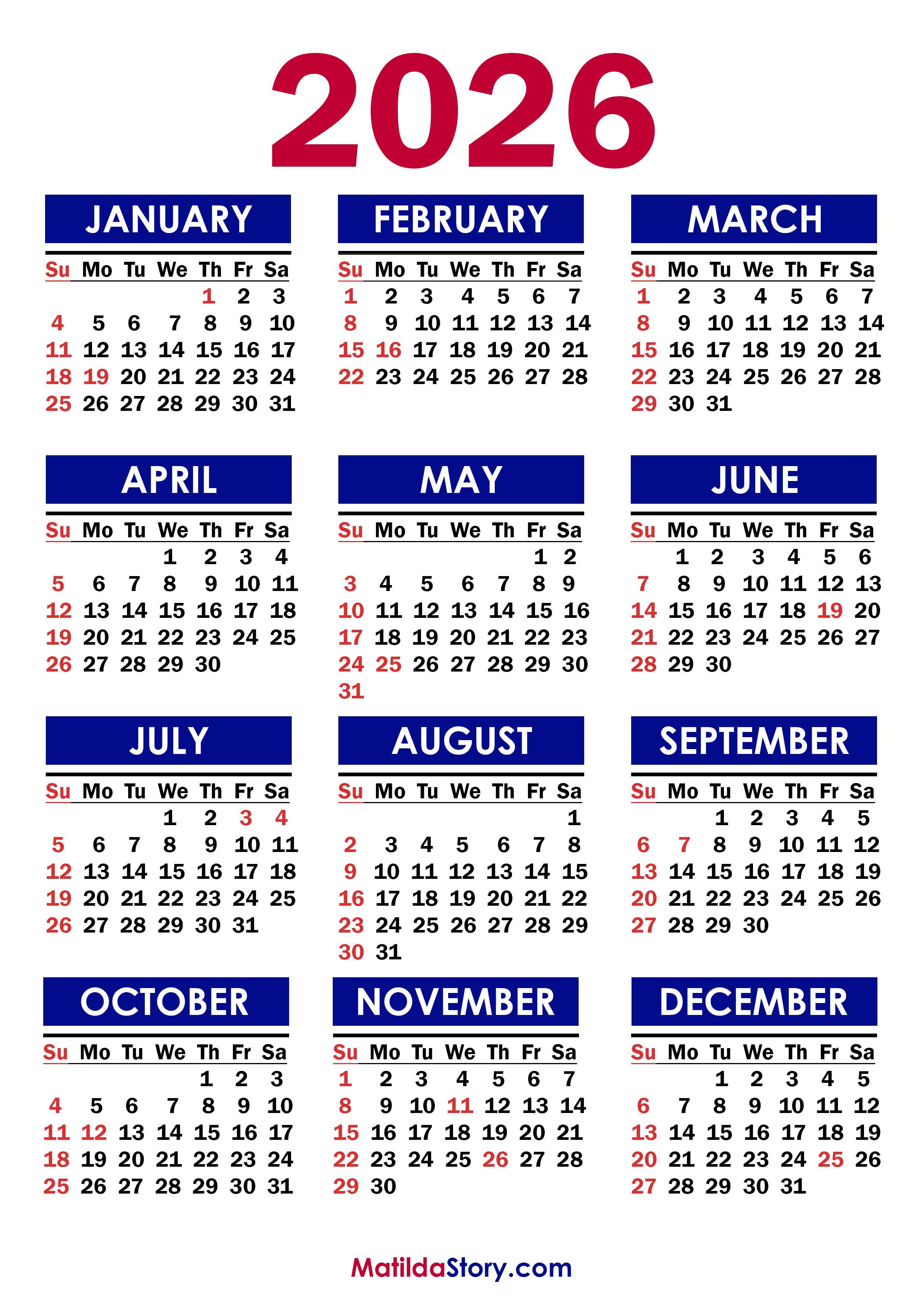 Free Printable 2026 Calendar with US Holidays