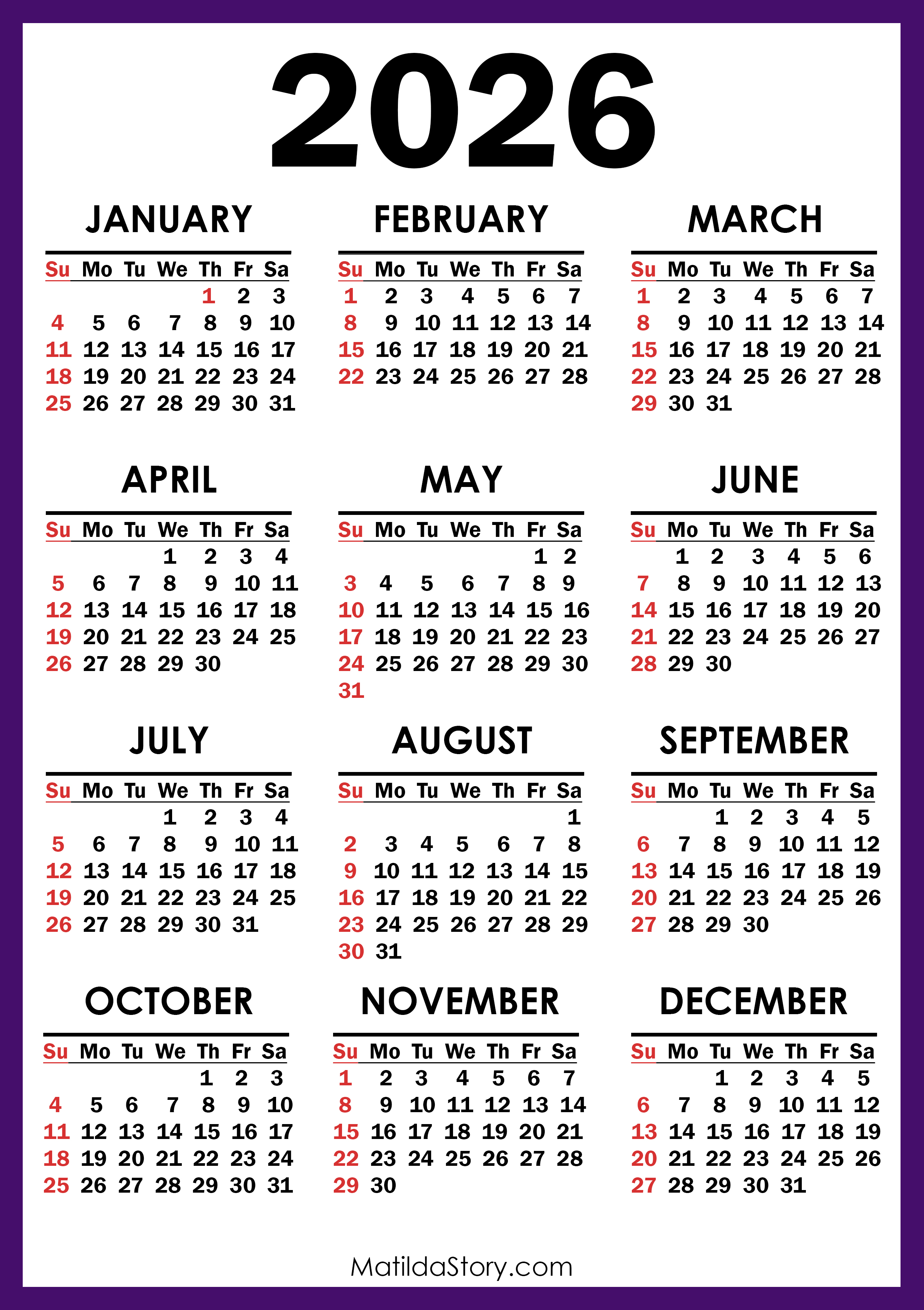 Free Printable 2026 Calendars – Vertical, Sunday Start