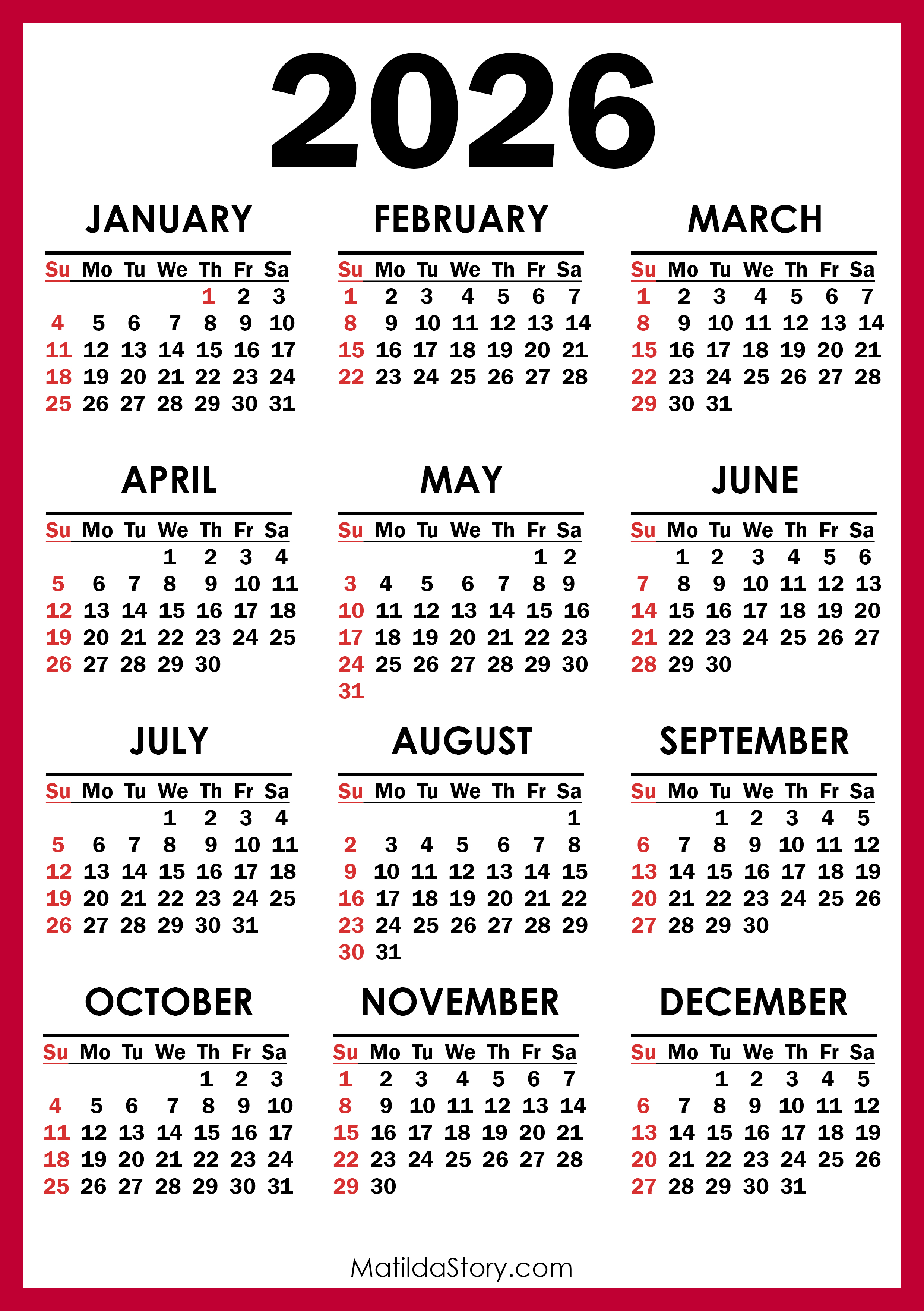 Free Printable 2026 Calendar – Red