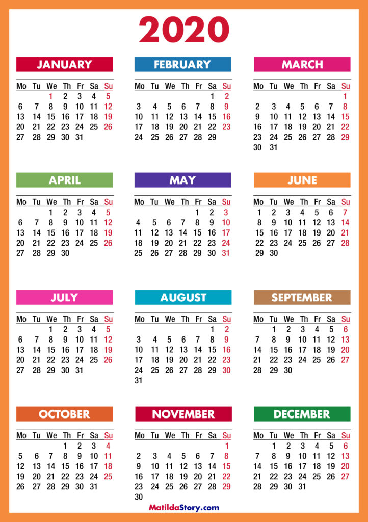 2020 Calendars• Calendars• High Resolution Calendars• High Resolution Calendars Monday Start 2020 Calendar Printable Free, Colorful, Red, Orange – Monday Start 09/06/202009/06/2020
