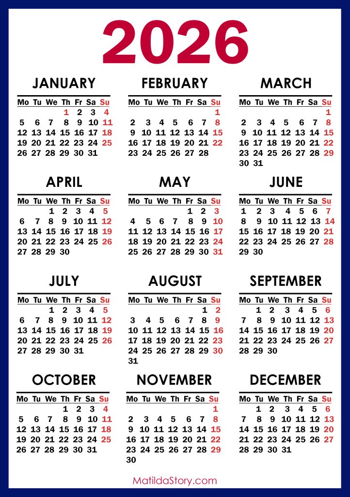 2026 Calendar Printable Free, Vertical – Monday Start