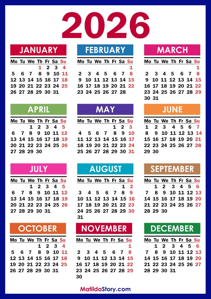 Yearly Calendars Free Printable 2026 Calendar – Colorful, Vertical, Monday Start 03/28/202603/28/2026