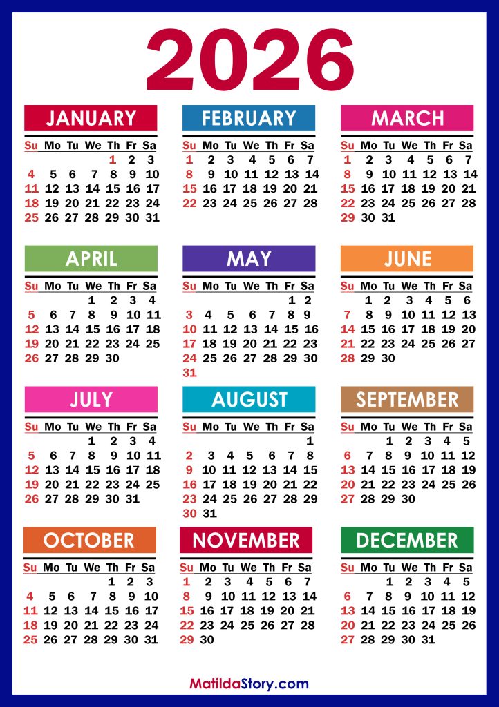 Yearly Calendars Free Printable 2026 Calendar – Colorful, Vertical, Sunday Start 03/28/202603/28/2026