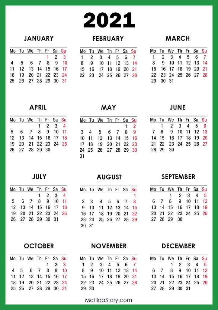 2021 Calendars• Basic Calendars Monday Start• Calendars 2021 Calendar Printable Free, Green – Monday Start 02/05/202002/05/2020