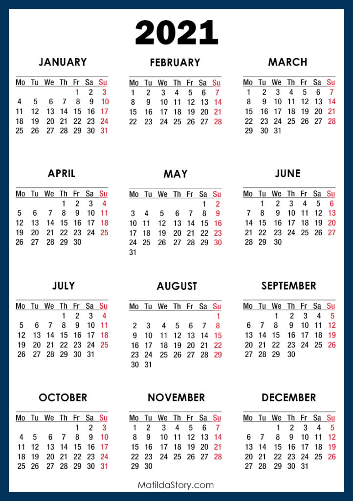 2021 Calendars• Basic Calendars Monday Start• Calendars 2021 Calendar Printable Free, Blue – Monday Start 02/05/202002/05/2020