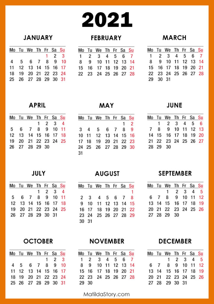 2021 Calendars• Basic Calendars Monday Start• Calendars 2021 Calendar Printable Free, Orange – Monday Start 02/05/202002/05/2020