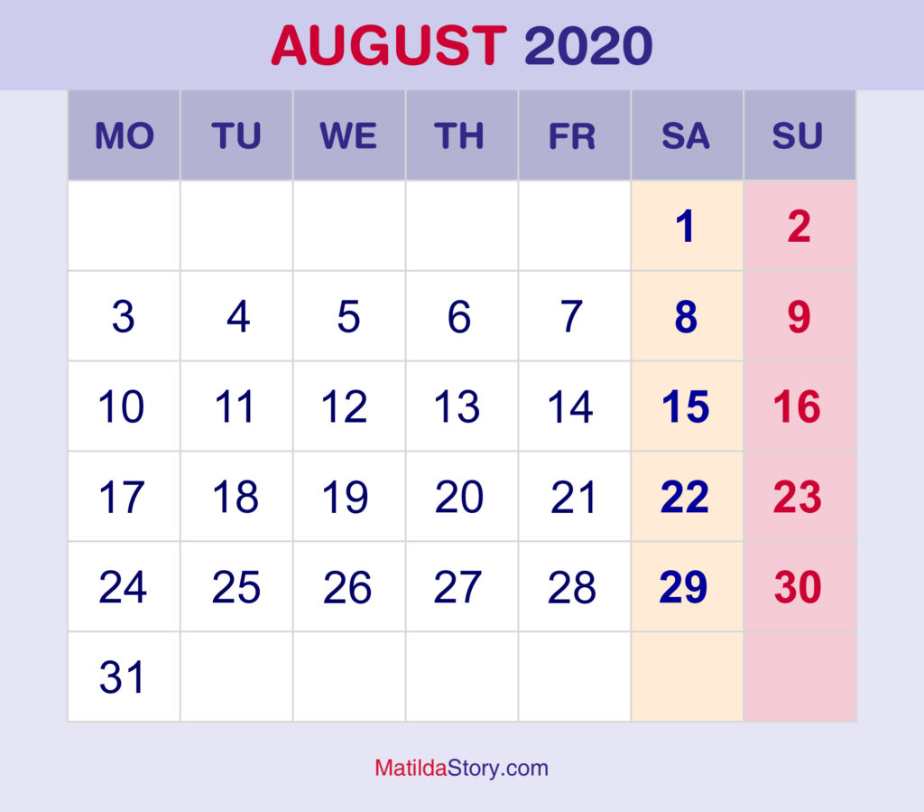 2020 Calendars• Calendars• Monthly Calendars• Monthly Calendars Monday Start August 2020 Monthly Calendar, Monthly Planner, Printable Free – Monday Start 02/05/202002/06/2020