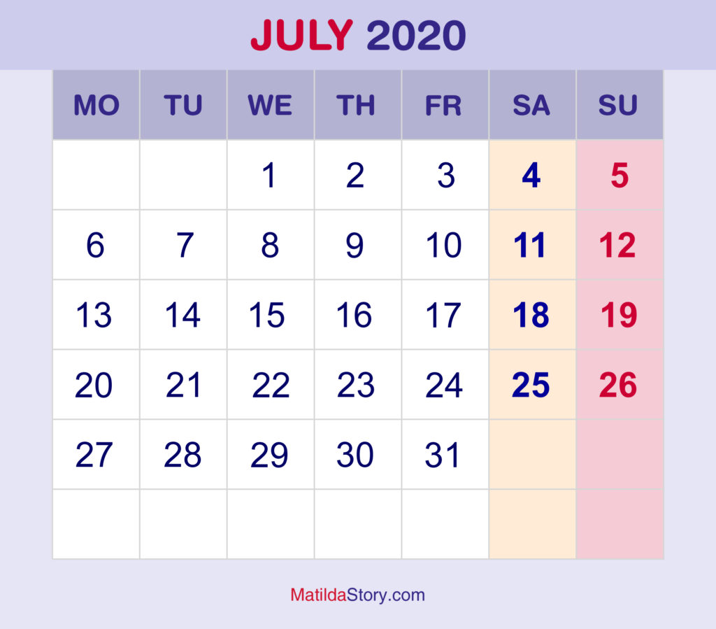 2020 Calendars• Calendars• Monthly Calendars• Monthly Calendars Monday Start July 2020 Monthly Calendar, Monthly Planner, Printable Free – Monday Start 02/05/202002/06/2020